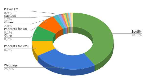 Statystyki i słupki słuchalności nie są dla nas najważniejsze. To raczej duże zaskoczenie i świadczy o głodzie wiedzy a także o tym, że nasze audycje są potrzebne. Niektóre audycje mają ponad dziesięć tysięcy pobrań, inne kilka tysięcy. Niektóre audycje są ilustracją hasła w Wikipedii w ramach projektu "Podkasty dla Wikipedii". Siła podkastów tkwi w tym, że wszystkie archiwalne audycje stale są dostępne dla zainteresowanych w iTunes, poprzez kanał RSS, w wielu specjalistycznych wyszukiwarkach podkastów a także nadawane w radiach internetowych. Licencja CC-BY ułatwia ponowną publikację. Poniżej grafika przedstawiająca proporcje udziału czytników.